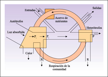 El diagrama anterior muestra el flujo unidireccional de energía y el reciclado de materiales. PG = producción bruta; PN = producción neta; P = producción heterotrófica; R = respiración.